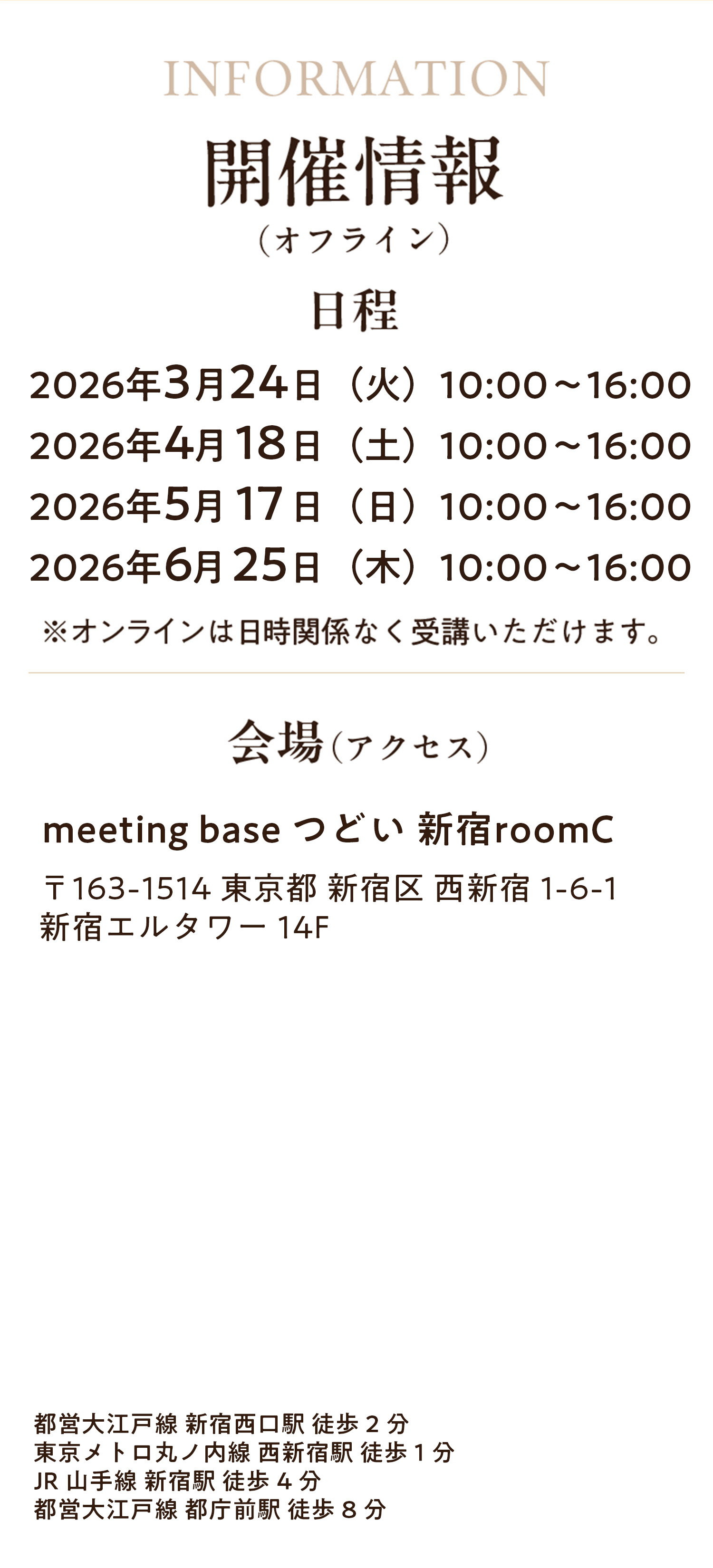 1週間に分けて講座動画を視聴オンライン受講(動画配布) ポイント:・ご自宅や好きな場所で。7つの単元に分かれているので、例えば1週間サイクルで受講可能・忙しい方、外出が難しい方にもおすすめ・休憩を挟みながら無理なく受講できる・パソコンでもモバイルでも受講可能