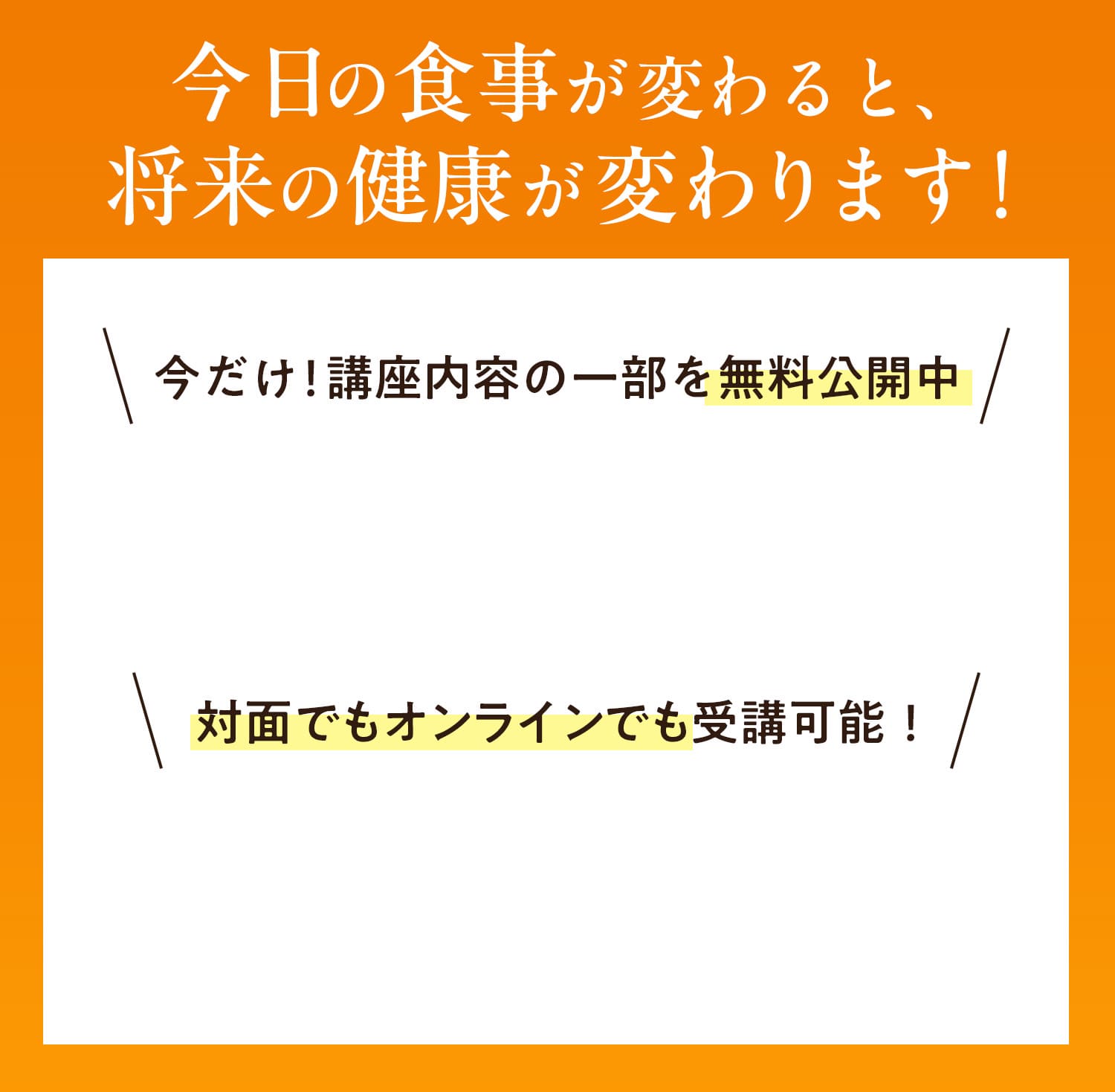 ”脳科学×栄養学”から60代ー70代に特化した健康知識が学べる資格講座シニア健康フードマイスター 脳科学✖︎栄養学✖︎実践 60代〜70代の体の変化に合わせて、「脳科学×栄養学×実践」の3つの視点から”無理なく続けられる食事術”を学べます。 講座内容のご紹介 01:筋肉量・骨密度を守るための「栄養戦略」 02:認知機能を守る「脳科学×栄養」の最新知見 03:生活習慣病と食事の密接な関係 04:AGE(糖化)と老化の進行を遅らせる食べ方 05:腸から整える「脳腸アプローチ」 06:飲み物・間食・ストレス管理の実践スキル